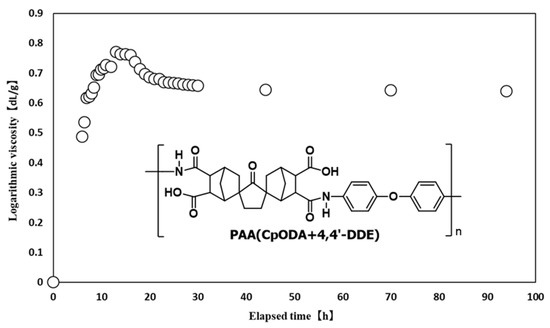 The variation in the logarithmic viscosity of the PAA with elapsed time since adding CpODA into the 4,4′-DDE solution.