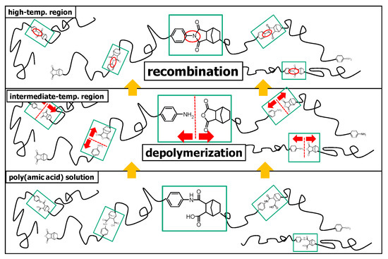 In the second step, the PAA was imidized through three methods involving a chemical, a thermal or a combined chemical and thermal process using the same lot of PAA. In a conventional thermal method, imidization temperature influenced dramatically the film quality and molecular weight of the polyimide (Table 1, Figure 2). When PAA(CpODA+1,3-BAB) prepared from CpODA and 1,3-bis(4-aminophenoxy)benzene was cured at 250 °C after being cast on the glass plate, the resulting PI(CpODA+1,3-BAB) film was brittle and the number-averaged molecular weight (Mn) was 41 thousands. However, on curing the PAA over the glass transition temperature of the PI(CpODA+1,3-BAB) (Tg = 290 °C), the flexible polyimide films were obtained, and the molecular weights increased several times. In the case of PAA(CpODA+3,4′-DDE), the flexible film was given only by curing at 350 °C. The molecular weights increased 5–8 times by curing around or over the Tg, which means that the post-polymerization took place at the temperature [30]. An imaginary depiction of post-polymerization around Tg is shown in Figure 3. The PAAs undergo depolymerization at intermediate-temperature region (100–250 °C), which results in the molecular weight decrease. As increasing temperature up to 350 °C, post-polymerization occurs around the Tg in solid state and the polymer recovers high molecular weight. It is known that similar phenomenon happens in aromatic polyimide synthesis [32].