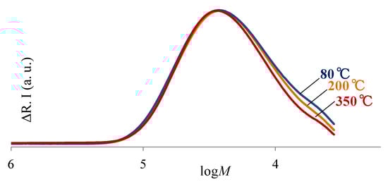 The SEC profiles of the PI(CpODA+3,4′-DDE) films prepared by the chemical imidization method are shown in Figure 5, where blue, orange, and red line curves denote the PI films cured at 80, 200, and 350 °C, respectively. Three curves have almost the same shape and maximum peak position. This means that high molecular weight is fixed due to suppression or inhibition of depolymerization of PAA by a chemical imidization. Furthermore, post-polymerization was not undergone due to the absence of free amino group.