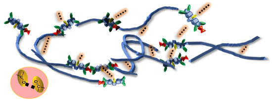 The thermal properties of the polyimide films prepared by three different methods are summarized in Table 2. The films possess the 5% weight-loss temperatures (T5) over 450 °C and the decomposition temperatures (Td) in a range of 475–501 °C. Td is noted as the intersection of the extrapolations of the two slopes in the TGA curve. Introduction of polyalicyclic unit results in less probability of the main chain scission at high temperature. The polyimides have Tgs over 330 °C except for 1,3-BAB-based one, which consists of the diamine having two kinked ether linkages. The high Tg would be most likely due to a dipole–dipole interaction between the keto groups of the polymer chains (Figure 6) and also be attributable to development of the rigid polyalicyclic unit. The polyimide films exhibit CTE between 17 and 57 ppm/K. Comparing the CTE of PI(CpODA+3,4′-DDE) films, the value of chemically imidized film is lower than that of the thermally imidized one. In plain-oriented polymer chain, orientation relaxation might occur at high temperature in the curing process. In other words, non-orientation relaxation might take place in the chemical imidization process [34].