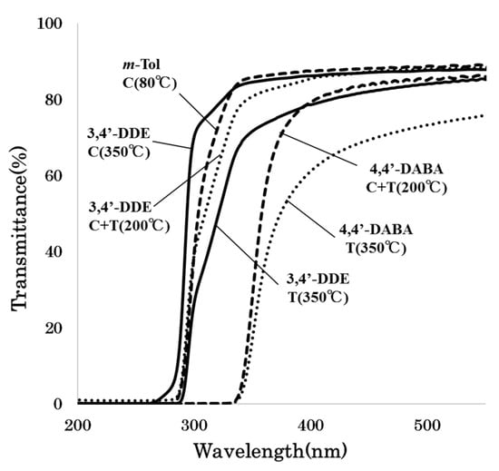 The UV-vis transmission spectra of the polyimide films prepared from CpODA and aromatic diamines by three different methods. T: thermal imidization (350 °C), C + T: combined chemical and thermal imidization (200 °C), C: chemical imidization (80–350 °C).