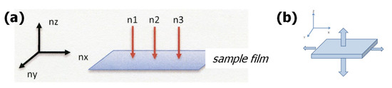 The thickness and refractive index at three points of the polyimide film were measured using a Metricon Model 2010/M Prism Coupler [35]. The in-plane and out-of-plane retardations (R0 and Rth) of the polyimide film are given by the following equations, where nx, ny, and nz are refractive indexes of x, y, and z axis directions, and d denotes thickness of the film in nm unit (Figure 8a).