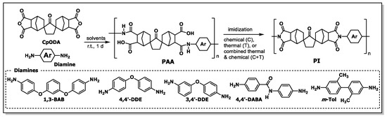 - Matsumoto, T.; Ishiguro, E.; Komatsu, S. Low temperature film-fabrication of hardly soluble alicyclic polyimides with high Tg by a combined chemical and thermal imidization method. J. Photopolym. Sci. Technol. 2014, 27, 167–171. [Google Scholar] [CrossRef][Green Version]