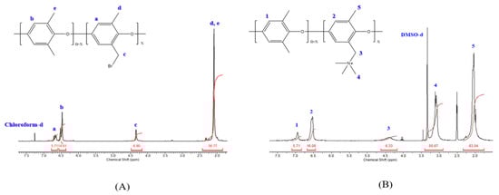 1H–NMR spectra of (A) brominated polyphenylene oxide (Br–PPO) and (B) polyphenylene oxide containing quaternary ammonium (QA–PPO).