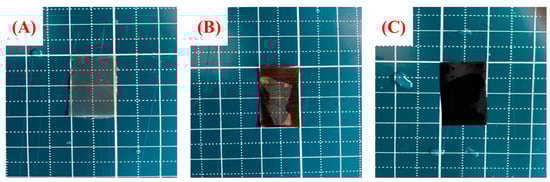 Changes in appearance of BAEMs after impregnation with 1 M KOH solution: (A) QA–PPO/PVDF(2/8), (B) QA–PPO/PVDF(3/7), and (C) QA–PPO/PVDF(4/6).