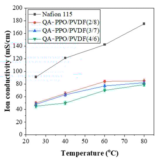 The ion conductivities of the BAEMs with different ratios of PVDF were measured at 25, 40, 60, and 80 °C. First, the conductivities tended to be proportional to the temperature, as shown in Figure 5 and Table 3. In particular, QA–PPO/PVDF (2/8) exhibited an ionic conductivity of 85 mS/cm at a temperature of 80 °C (Table 3). However, as the content of QA–PPO in-creased, the ionic conductivity did not increase. It was found that the ionic conductivity eventually showed the same trend as the hydration number. Considering the above performances of the QA–PPO/PVDF (2/8) sample, this sample was used to measure the performance of the redox flow battery.