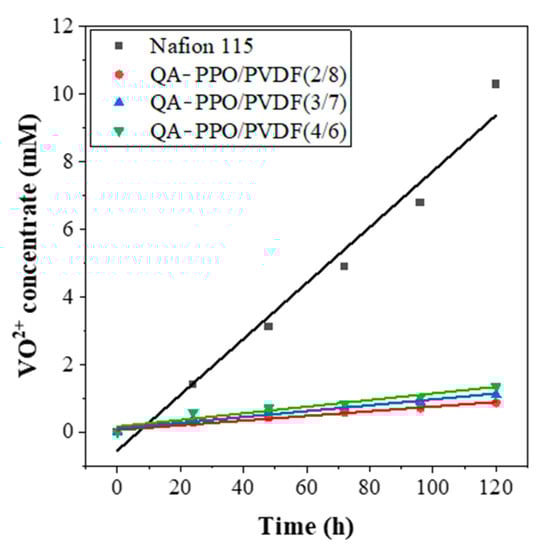The crossover of active materials such as vanadium species in redox flow batteries is a crucial issue that could lead to a serious self-discharge problem. In an operating battery system, the membrane is in contact with concentrated H2SO4, containing vanadium cat-ions with four different oxidation states. At the same time, due to the partitioning of ions into the membrane, the concentration electrolyte affects the ion transport behavior and ion equilibrium within the membrane [35,36]. The P value of the tested membranes was calculated by the change of VO2+ concentration in the MgSO4 solution with time, as shown in Figure 6. It can be seen that the VO2+ concentrations decreased as the PVDF ratio increased, which can be explained by the greater hydrophobicity as the PVDF ratio increased. When the hydrophilicity is excellent, the crossover phenomenon becomes severe [37]. However, in this case, it is judged to be the effect of reducing the crossover phenomenon by the positive charge of quaternary ammonium and the hydrophobicity of PVDF.