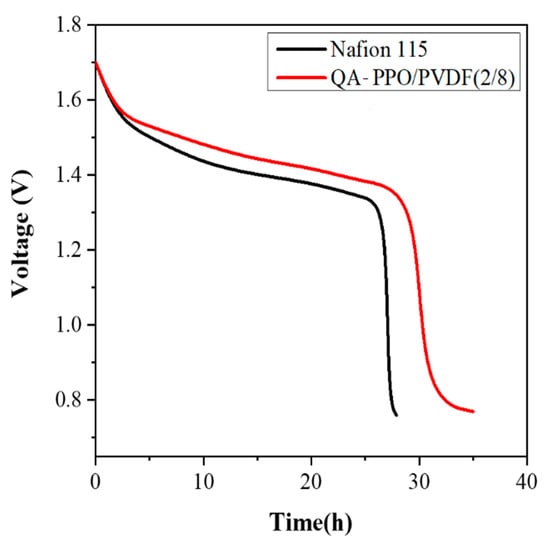 To systematically study the performance of BAEMs, the OCV of VRFB single cells was measured. The OCV is a critical parameter used to verify the vanadium ion cross rate in the membranes, as the vanadium ions crossing the membrane result in self-discharge and the cell voltage declines accordingly. Figure 7 shows that the voltage decay of cells assembled with BAEM (30.1 h for QA–PPO/PVDF(2/8)) is lower than that of the commercial membrane (27.9 h for Nafion 115). It can be seen that the BAEM, QA–PPO/PVDF(2/8), suppresses the permeation of vanadium ions, in good agreement with the results in Figure 6 [38]. Accordingly, the membrane blended using PVDF is expected to be an alternative to Nafion membrane, as it has better performance.