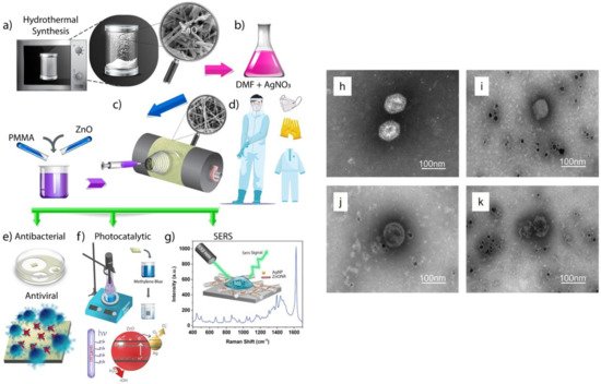- Karagoz, S.; Kiremitler, N.B.; Sarp, G.; Pekdemir, S.; Salem, S.; Goksu, A.e.G.; Onses, M.S.; Sozdutmaz, I.; Sahmetlioglu, E.; Ozkara, E.S. Antibacterial, antiviral, and self-cleaning mats with sensing capabilities based on electrospun nanofibers decorated with ZnO nanorods and Ag nanoparticles for protective clothing applications. ACS Appl. Mater. Interfaces 2021, 13, 5678–5690. [Google Scholar] [CrossRef]