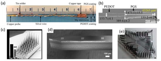 The macroscopic image (a) and morphology (b) of an Mg-based microwire electrode. An illustration of Utah-type (c), Michigan-type (d) and PDMS-based electrodes (e). (a,b) are reproduced with permission from [14], Copyright 2020, Elsevier. (c) is reproduced with permission from [18], Copyright 2014, iopscience.iop.org. (d) is reproduced with permission from [19], Copyright 2015, Elsevier. (e) is reproduced with permission from [27], Copyright 2011, Elsevier.