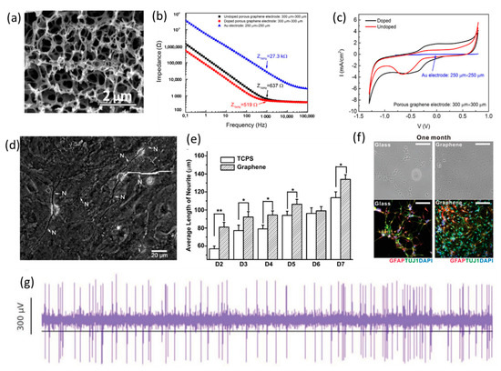 (a) SEM image of the 3D porous graphene. (b) EIS of a comparison of doped and undoped porous graphene and Au electrodes. (c) CV-characterization of porous graphene and Au electrodes. (a–c) are reproduced with permission from [158], Copyright 2016, Springer Nature. (d) Phase-contrast micrograph of typical neurons showing a trace along the extension of neurite (N) used for length calculation, (e) average number of neurites per neuron on TCPS and graphene during the developing period (D2–D7). (d,e) are reproduced with permission from [148], Copyright 2011, Elsevier. (f) Bright-field (top row) and fluorescence (bottom row) images of hNSCs differentiated on glass (left) and graphene (right) after one month of differentiation. The differentiated hNSCs were immune-stained with GFAP (red) for astroglial cells, TUJ1 (green) for neural cells, and DAPI (blue) for nuclei. Note that more hNSCs were adhered to graphene than to glass. All scale bars represent 200 μm. (f) is reproduced with permission from [169], Copyright 2011, Wiley. (g) Representative voltage time trace of graphene-coated NeuroNexus probe. (g) is reproduced with permission from [168], Copyright 2019, Wiley.