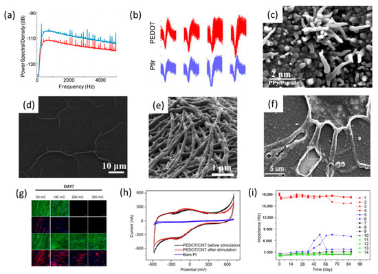 (a) Average power spectral density measured on the PEDOT and PtIr electrodes during surgery under high isoflurane. (b) 100 overlaid action potential waveforms (0.8 ms for each) recorded on different electrodes of the same array. (a,b) are reproduced with permission from [192], Copyright 2011, IEEE. The SEM image of the (c) PPy/DCDPGYIGSR, (d) PPy-NGF, (e) PEDOT nanotubes, and (f) cell-templated PEDOT coating. (c) is reproduced with permission from [200], Copyright 2003, Elsevier. (d) is reproduced with permission from [202], Copyright 2007, Wiley. (e) is reproduced with permission from [206], Copyright 2008, Elsevier. (f) is reproduced with permission from [187], Copyright 2007, Elsevier. (g) Immunofluorescence images of C2C12 cells cultured on PPy and PDA/PPy samples for 7 days. The cells were stained for F-actin (green), MHC (red) and nuclei (blue). Scale bars = 200 μm. (g) is reproduced with permission from [203], Copyright 2018, ACS. (h) Cyclic voltammograms of a bare Pt electrode and PEDOT/CNT coated electrodes before and after long-term stimulation. (i) Monitored electrode impedance changes at 1 K Hz over time during three months of soaking in PBS. Plots 1–4 in red are bare Pt electrodes; plots 5–6 in blue are ultrathin PEDOT/CNT-coated (deposition charge less than 5 mC) Pt electrodes during stimulation; plots 7–10 in black and plots 11–14 in green are normal PEDOT/CNT-coated (deposition charge more than 10 mC) Pt electrodes with (7–10) and without (11–14) stimulations. (h,i) are reproduced with permission from [207], Copyright 2011, Elsevier.