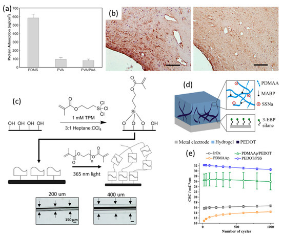 (a) Non-specific adsorption of protein (fibrinogen) on PDMS without a coating, with PVA coatings, and with PVA/PAA IPN (PAA/PVA = 10 mol%) film coatings (n = 3). (b) GFAP immunostaining of uncoated (left) and PVA/PAA IPN (PAA/PVA = 10 mol%) film-coated (right) PDMS implants after six weeks post-implantation (bar = 50 mm). (a,b) are reproduced with permission from [213], Copyright 2009, Elsevier. (c) Soft PEG hydrogel coatings were formed on borosilicate glass capillaries through a multistep process. (c) is reproduced with permission from [48], Copyright 2017, Springer-Nature. (d) Schematic depiction of the CPH composition. The hydrogel component PDMAAp consists of the PDMAA backbone, the MABP crosslinker and the SSNa units, which serve as counterions during the deposition of PEDOT. The hydrogel is covalently attached to the surface with 3-EBP silane. (e) The mean CSC of the different coating materials is shown vs. repetitive cycling (n = 1000 cycles) in PBS. (d,e) are reproduced with permission from [217], Copyright 2017, Elsevier.