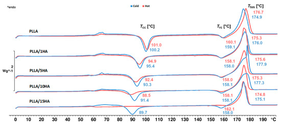 DSC curves of the PLLA a PLLA/HA nanocomposites obtained during the first heating.