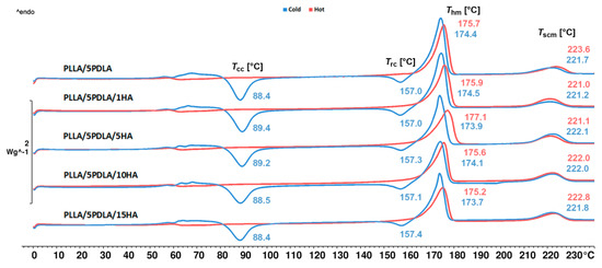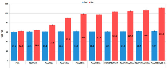 The same trend was noticed for VST, where PLLA/15HA increased by 37% and PLLA/5PDLA/15HA by 44%. These results prove that the developed morphology during in-mold annealing at 100 °C for 2 min worked synergistically, and enhanced temperature resistance was reached due to specific stereocomplex interactions at a low loading of PDLA (5 wt.%) and relatively high HA loading (15 wt.%).