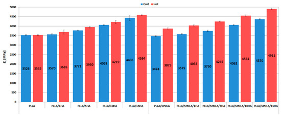 The graph in Figure 3 shows that the value of the tensile modulus (Et) increases with increasing hydroxyapatite content. For pure PLLA, the value of the tensile modulus after in-mold annealing is comparable to the samples originating from the cold mold. In-mold annealed samples based on PLLA matrix shows a slight increase in Et when compared to samples from cold mold. Such an increase is related to a higher degree of crystallinity (see Table 2 and Table 3). Furthermore, Ko et al. [39] observed the same trend using unmodified nano HA (up to 15 wt.%) in PLA samples. In the case of asymmetric samples with 5 wt.% PDLA, the difference was more pronounced than for materials where the matrix contained only PLLA. The synergistic action of specific stereocomplex interactions and increased nucleation rate due to HA caused during the processing and development of the morphology an increase in the modulus of elasticity when compared to samples from cold mold. In-mold annealed PLLA/5PDLA/15HA samples show a ~28% increase of Et when compared to neat PLLA.