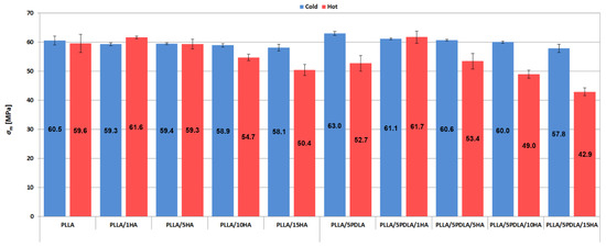 The resulting values of the tensile strength (σm) are shown in Figure 4, which shows that in the case of samples originating from the cold mold, the value of the tensile strength hardly changes depending on the content of the HA. For the samples containing PLLA and 1% HA that were injected into the hot mold, it can be seen that there was a slight increase in the value of the tensile strength compared to pure PLLA. In the case of the PLLA/5PDLA/1HA samples from the hot mold, the difference in strength is 17% higher compared to PLLA/5PDLA. The strength values of the materials gradually decrease with contents from 5% HA onwards. This is most likely due to the higher HA content, which agglomerated into larger clusters (see SEM fracture analysis). These agglomerates acted as structural defects and caused the anticipated failure of the samples under tensile stress. Furthermore, Vadori et al. [47] have shown that increasing the mold temperature of PLA decreases the impact toughness and ductility of PLA.