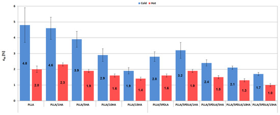 Elongation at break (εtb) plots (see Figure 5) showed the same trend; all in-mold annealed samples showed a sharp decrease in ductility. Furthermore, PLLA based samples from cold molds show an obvious decrease of εtb with increasing content of HA. Lower ductility of cold mold samples has also been observed after blending PLLA with 5% of PDLA.
