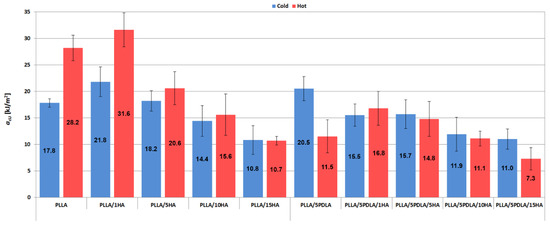 From the plots in Figure 6 it can be seen that the in-mold annealed specimens with PLLA matrix have higher impact toughness (acU) compared to the specimens from the cold mold. The highest values were observed for in-mold annealed PLLA/1HA nanocomposites. The same trend has been observed by Kawamoto et al. [48] using different nucleation agents. High-temperature molding (110 °C) of PLLA and nucleating agents based on a mix of ethylenebis-(12-hydroxystearylamide) (EBHS)/talc (1 wt.% each) and octamethylenedicarboxylicdibenzoylhydrazide (OMBH) at 1 wt.% loading. Furthermore, the value of impact toughness decreased with an increasing percentage of HA in PLLA. A similar trend of the impact toughness was observed for the samples originating from the hot mould with a base matrix containing 5 wt.% PDLA.