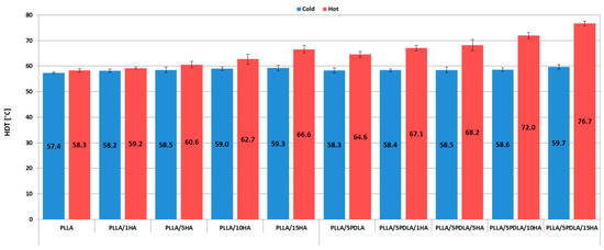 The heat deflection temperature (HDT) and Vicat softening temperature (VST) of cold and hot molded samples are shown in Figure 7 and Figure 8, respectively. VST is the temperature at which a material loses its stability form, and HDT is the temperature at which the material loses its load-bearing capacity. Both HDT and VST results of cold mold samples proved that a degree of crystallinity below 20% (see Table 2 and Table 3) is insufficient to enhance thermal stability. The same results were reported by Ferri et al. [41]. Tang et al. [49] noticed enhanced HDT of PLA with 1% EBH molded at room temperature and then annealed for 1, 2, 4, 10, and 20 min at 105 °C. A threshold for crystallinity content was noticed when the crystallinity reached 25%. Our in-mold annealed samples show the same trend. However, this phenomenon is more obvious from VST results where an in-mold annealed PLLA/5HA sample at 25.4% crystallinity reached VST of 75.6 °C and a cold mold sample at 15.6% crystallinity reached only 61.4 °C. The highest HDT increase of in-mold annealed samples without PDLA was noticed by 13% for PLLA/15HA and by 24% for PLLA/5PDLA/15HA samples when compared to hot mold neat PLLA.