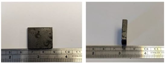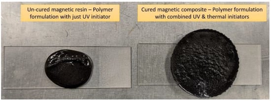 UV-curable resin formulations require UV for the reaction initiation step. Free radicals are only generated during UV irradiation which enable reaction propagation and crosslinking of the monomers. One of the challenges with magnetic particle reinforced UV curable prepolymers is to achieve complete solidification as a result of polymerization. UV curable prepolymers reinforced with magnetic fillers experience lower levels of monomer conversion due to opacity introduced by the magnetic fillers. In addition to free radical generation through photochemical methods, a heat-initiated monomer conversion was introduced by adding the AIBN thermal initiator to the polymer formulation [33]. Initiator loading fractions ranging from 0.1 wt% to 0.4 wt% were tested. Adding AIBN at 0.4 wt% to a formulation containing magnetic fillers at 80 wt% was observed to render a cured magnetic polymer composite. Polymer casting was adopted for the initial trials. The prepolymer was observed to cure within an hour at temperatures ranging from 50 °C to 70 °C. A temperature range is indicated to account for any fluctuations within the oven. Initial results shown in Figure 1 indicate the ability of the material to fully cure through heat-initiated free radical polymerization. The cured composite was cut and smoothed using emery cloth for further observations (see photographs in Figure 2) exhibiting some voids in a solid material.