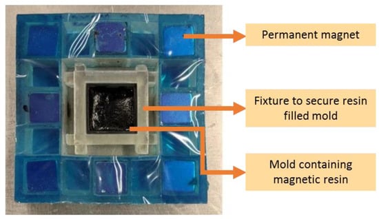 The magnetic alignment setup utilized to develop field structured magnetic composites was composed of a magnetic array with eight cube-shaped permanent magnets arranged in an orientation to deliver a uniaxial magnetic field. In a previous study, through the finite element method in magnetics, it was observed that the magnitude of magnetic flux density produced by the magnetic array was close to 0.3 Tesla [34]. The development of the uniaxial magnetic field within the magnetic array was further confirmed using optical microscopy where particle alignment within a magnetic particle reinforced resin droplet was evaluated [34]. The photograph in Figure 3 shows the setup prepared for manufacturing field structured magnetic composites. Securing the mold filled with the magnetic particle reinforced prepolymer was critical as the mold lost its stability within the magnetic array due to the magnetic forces. The fixture to hold the alignment magnets in the magnetic array, the mold securing fixture, and the resin holding mold were all 3D printed using the Autodesk Ember Digital Light Processing (DLP) 3D printer (Autodesk Inc., San Rafael, CA, USA). Using this method, magnetic composites with the dual-cure prepolymer and epoxy-based prepolymer were fabricated and tested.