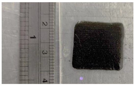 Following the polymer casting trials, the dual-cure resin formulation was utilized to 3D print magnetic composites using the material jetting AM process. The process parameters of deposition pressure and speed were adjusted to 3 kPa and 10 mm/s, respectively. Thickness settings were 0.35 mm for the initially deposited layer and 0.5 mm for subsequent layer deposition. The photograph in Figure 4 shows a single deposited layer on an acrylic sheet substrate. Note that UV curing of the deposited layer in conjunction with particle alignment using the magnetic array was accomplished using ‘manufacturing scenario B’ established in a previous publication by the present authors [35]. In summary, the process step for each layer involves (i) material deposition, (ii) magnetic particle alignment for a set time, and (iii) UV exposure for 60 s. The photographs in Figure 5 show the material jetting equipment with the in-situ particle alignment system and the UV source for subsequent curing.