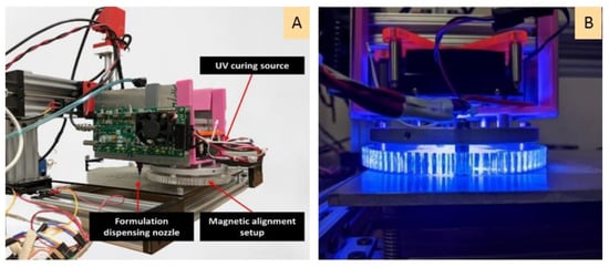 (A) Material jetting equipment with the in-situ particle alignment system and (B) UV source irradiating polymer sample for curing.
