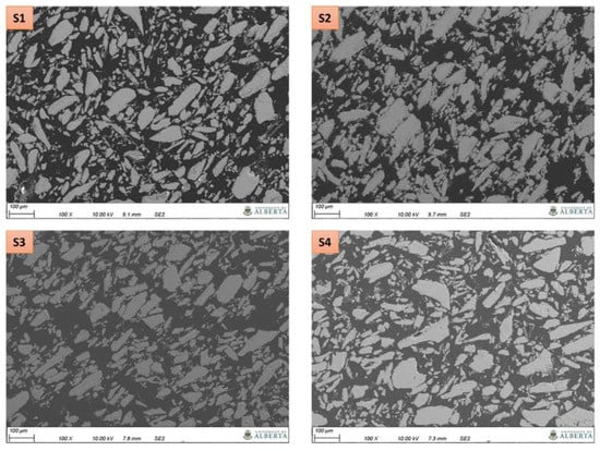 The morphology of composites consisting of magnetic particles in a polymer matrix was explored using SEM. The fundamental goal of the SEM study was to identify specific filler distribution and/or alignment characteristics due to the externally applied magnetic field. SEM micrographs of magnetic composites taken at two different magnifications are shown in Figure 8 and Figure 9. In the samples manufactured via polymer casting (S2 and S3) coupled with the magnetic field source, the SEM images exhibit particles structured in a specific direction. Arrows included in Figure 9 indicate apparent particle stacking and alignment. Such striations irrespective of the particle size elucidate the influence of an externally applied magnetic field. Similar microstructural features for field structured magnetic composites were observed by Gandha et al. [31] for anisotropic NdFeB powder reinforced polyamide, where the magnetic filler was aligned using a post printing alignment field of 1 Tesla. Differences in the apparent degree of particle alignment and stacking between sample S2 and S3 in Figure 9 are likely related to the prepolymer viscosities. From previous research it is known that the viscosity of the acrylate-based prepolymer is approximately 0.3 Pa·s whereas the value for the epoxy resin is 7 Pa·s [20,35].