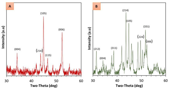 XRD patterns of (A) anisotropic magnetic composite fabricated with external magnetic field application, and (B) isotropic magnetic composite fabricated without an external magnetic field.