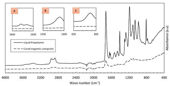 FTIR spectra of uncured liquid prepolymer and cured magnetic composite. Insets indicate FTIR spectral regions: (A) 1600 cm−1 to 1660 cm−1, (B) 1400 cm−1 to 1430 cm−1, and (C) 800 cm−1 to 830 cm−1.