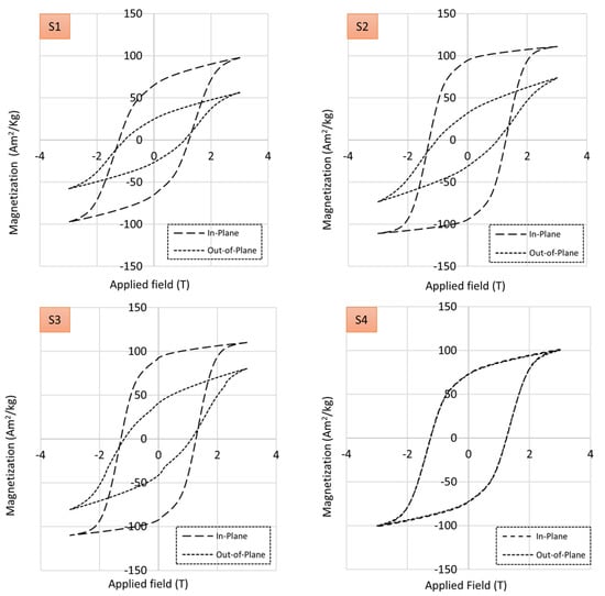 Composites reinforced with magnetic particles can be characterized by their magnetic saturation, remanence, and coercivity. Composites containing hard ferromagnetic particles should generate sufficient magnetic flux for a given application once they are magnetized, i.e., energized by applying a magnetic field using electromagnets. However, the properties of magnetic composites are dependent on microstructure, temperature, and demagnetizing fields [31]. The graphs in Figure 13 depict hysteresis loops measured using the vibrating sample magnetometer along the direction of particle structuring (in-plane) and perpendicular to the direction of particle structuring (out-of-plane). The samples fabricated applying an external magnetic field (S1, S2 and S3) exhibit significant enhancements in magnetic properties (saturation magnetization, squareness, and coercivity) along the in-plane easy direction over the out-of-plane direction. The presence of an applied magnetic field can be clearly seen to result in a preferred magnetization direction and strong anisotropy. This magnetic anisotropy is conferred by the preferential alignment of the magnetic filler powders along the curing applied field, as evidenced in Figure 8, Figure 9 and Figure 11. Field-structured magnetic composites developed using polymer casting (S2 and S3) exhibited anisotropic magnetic properties comparable to, or greater than, the isotropic specimen (S4). For the latter, no distinguishable differences can be ascertained between the in-plane and out-of-plane hysteresis loops. While the 3D printed sample also exhibits enhanced in-plane properties over the out-of-plane direction, it needs to be noticed that its properties are lower compared to the other samples. For example, the remanence to saturation ratio, which characterizes the degree of anisotropy, was observed to be approximately 0.85 for samples fabricated using polymer casting and 0.67 for the 3D printed sample. As mentioned earlier, a lower particle alignment time was employed for 3D printed samples (to mitigate magnetic resin deformation [35]), which is seen to have caused the somewhat reduced magnetic properties. Nevertheless, even with the reduced alignment time, the composite exhibited pronounced anisotropic and in-plane magnetic properties comparable to the other samples.