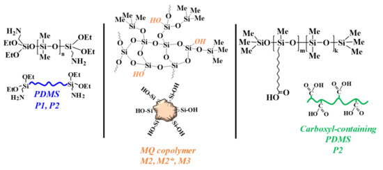 M2 is an MQ copolymer [(CH3)3SiO0,5]1[SiO2]2 containing 5.8 wt.% OH groups, Mn = 10,700, Mw = 14,200, Mw/Mn = 1.3; (Figure S4 in Supplementary Materials);