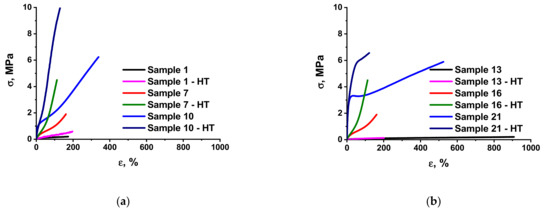 The main mechanical characteristics of the molecular composites based on P1 and P2 are presented in Table 2 and Table 3, respectively. The presented plots (Figure 2a–e) show the effect of each component and HT on the mechanical behavior of the systems in question.