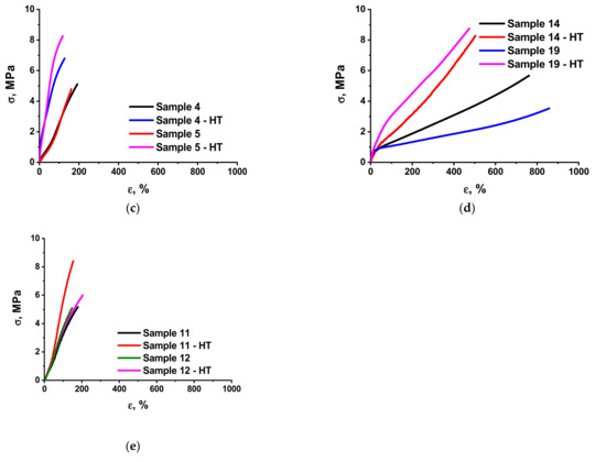 Deformation curves of molecular composites before and after HT: (a) Composites based on P1 containing P3, filled with 16,67 wt.% (Sample 7) or 33,33 wt.% (Sample 10) M2 and without (Sample 1) M2; (b) Composites based on P2 containing P3, filled with 16,67 wt.% (Sample 16) or 50,00 wt.% (Sample 21) M2 and without (Sample 13) M2; (c) Composites based on P1 not containing P3, filled with 16,67 wt.% ( Sample 4) or 33,33 wt.% (Sample 2) M2; (d) Composites based on P2 not containing (Sample 14) or containing (Sample 19) P3, filled with 33,33 wt.% M2; (e) Composites based on P1 not containing (Sample 11) or containing (Sample 12) P3, filled with 16,67 wt.% M3.