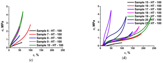 Dynamics of changes in mechanical hysteresis (2nd and 100th cycles) in composites with various compositions before and after HT: (a) Corresponds to the composites filled with 16.67 wt.% M2 based on P1 (not containing (Sample 4) or containing (Sample 7) P3) and P2 (containing (Sample 14) P3) before HT; (b) Corresponds to the composites filled with 16.67 wt.% M2 based on P1 (not containing (Sample 4) or containing (Sample 7) P3) and P2 (containing (Sample 16) P3) after HT; (c) Corresponds to the thermally treated composites based on P1 and P3 containing 9.09 to 33.33 wt.% M2 (100th cycles) (Samples 6–10); (d) Corresponds to the thermally treated composites based on P2 and P3, containing 9.09 to 50.00 wt.% of M2 (100th cycles) (Samples 15–21).
