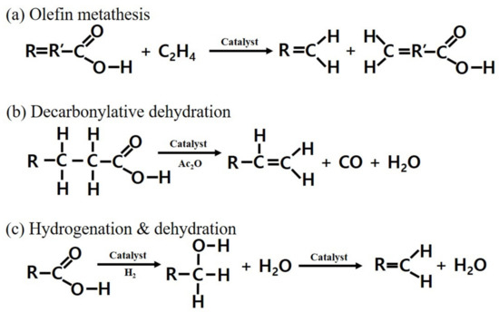 Linear-alpha-olefins (LAO) are versatile building blocks to produce universal or high-value chemicals used in many industries such as co-monomer for polyethylene and polypropylene, plasticizer, cosmetics, pharmaceuticals and synthetic lubricants. The market size of LAO was estimated as USD 12.5 billion in 2016 and is expected to grow with the increasing demand (USD 19 billion in 2024) [1]. As the consumption of LAO increases, research on methods to produce LAO has also increased. There are several common processes to produce LAO including (I) catalytic oligomerization of fossil-based ethylene [2,3], and (II) dehydrogenation of synthetic n-alkanes from Fischer–Tropsch processing of syngas or direct conversion of syngas to olefins [4,5,6]. LAO can also be obtained through the thermal cracking of heavy hydrocarbons (III) such as wax or waste plastics based on petroleum [7,8,9]. However, in these processes, the chain length of olefins is not easily controlled, resulting in limited yields for medium (C5-C12) to long-chain (C13+) LAO [10,11]. In addition, because we are facing environmental problems such as global warming and the depletion of fossil resources, many researchers have recently focused on the production of bio-derived rather than petroleum-derived LAO.