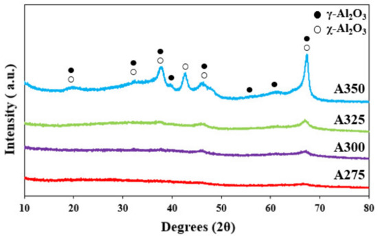 XRD profiles of the catalysts prepared by the solvothermal synthesis are depicted in Figure 2. No peaks were observed in the XRD pattern of A275 catalyst and some significant peaks started to appear from A325. However, A300 and A325 catalysts are essentially amorphous even though weak peaks were observed in the XRD pattern [38]. 19.4°, 32.5°, 37.48°, 39.3°, 45.8°, 60.7°, and 66.9° corresponded to the diffraction planes of γ-Al2O3 (JCPDS 00-050-0741) [39], and 18.5°, 31.0°, 37.3°, 42.6°, 46.3°, and 67.0° matched the diffraction planes of χ-Al2O3 (JCPDS 00-013-0373) [40]. Finally, the clearer γ-χ mixed phase of alumina appeared in the XRD pattern of the A350 catalyst. This meant that amorphous oxide or crystalline oxide could be synthesized according to the temperatures for solvothermal synthesis, even though all alumina precursors were calcined at 600 °C for 6 h.