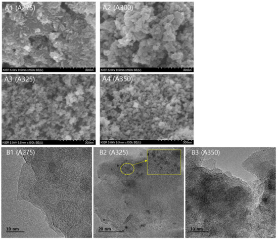 The surface morphologies and the local structures of the prepared alumina catalysts are shown in Figure 3. As can be seen in SEM images (A1–A4), the surface morphologies of the prepared alumina catalysts were significantly changed depending on the synthesis conditions; the nanoparticles were interconnected with each other and the spherical nanoparticles with uniform appearance appeared with the increase in synthesis temperature. Amorphous oxide was observed in FE-TEM images of A275 (B1) and A325 (B2), but there were some nanocrystallites within the amorphous matrix (B2). Lattice fringes of nanocrystallites were clearly visible in a FE-TEM image of A350 (B3), which is consistent with the results of XRD.