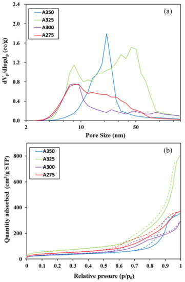 (a) Pore size distribution profiles; (b) N2 adsorption-desorption isotherms of the alumina catalysts A275, A300, A325, and A350.