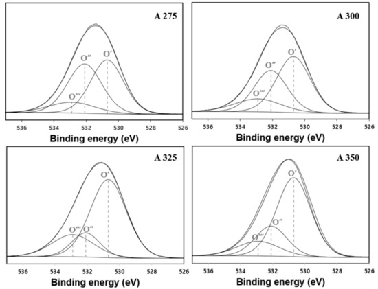 The XPS deconvolution results of O1s of the alumina catalysts A275, A300, A325, and A350.