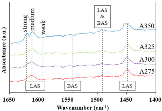 Pyridine-FTIR spectra of the synthesized alumina catalysts A275, A300, A325, and A350.