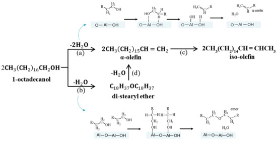 - Chen, M.; Lu, W.; Zhu, H.; Gong, L.; Zhao, Z.; Ding, Y. Dehydration of Long-Chain n-Alcohols to Linear α-Olefins Using Sodium-Modified γ-Al2O3. Ind. Eng. Chem. Res. 2020, 59, 4388–4396. [Google Scholar] [CrossRef]