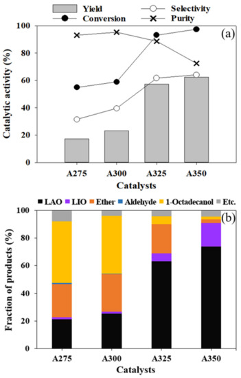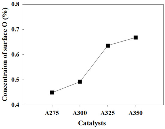 Figure 8 shows the results of the dehydration reaction of 1-octadecanol on the prepared catalysts. As shown in Figure 8a, the conversion of 1-octadecanol and selectivity and yield of 1-octadecene increased with an increase in catalyst synthesis temperature. This trend is accordant with the concentration of surface O in the catalysts, described in Figure 9. That is, the substantially enhanced conversion from using the A325 catalyst resulted from the increased Al/O ratio and the remarkably increased surface O in the acid–base pair catalytic system. However, the purity decreased with the catalyst synthesis temperature, indicating that isomerization of LAO to LIO occurred through re-adsorption of α-olefin on LAS on the surface. Remarkably strong bands at 1622–1594 cm−1 (LAS) of the A350 catalyst, as shown in Figure 6 (pyridine-FTIR), reflect that A350 has catalytic activity for isomerization reaction of the produced LAO as well as dehydration of alcohol. The product distribution after the dehydration reaction of 1-octadecanol is described in Figure 8b. Di-stearyl ether (C36H74O) cannot be identified by GC due to the high boiling point. Thus, SIMDIS was adopted as an indirect method to observe the product distribution including di-stearyl ether. A large amount of di-stearyl ether was produced when using A275, A300, and A325 catalysts and the content of di-stearyl ether apparently decreased, especially when using the A350 catalyst. This indicates that the produced ether was decomposed into LAO and water in the acid–base pair catalytic system, as mentioned above.