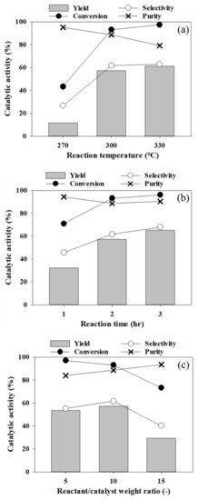 The results of 1-octadecanol dehydration according to various conditions: (a) 2 h, 500 rpm, N2 15 bar, 1 g of 1-octadecanol, 0.1 g of catalyst (A325), 20 mL of n-dodecane; (b) 300 °C, 500 rpm, N2 15 bar, 1 g of 1-octadecanol, 0.1 g of catalyst (A325), 20 mL of n-dodecane, and (c) 2 h, 300 °C, 500 rpm, N2 15 bar, 1 g of 1-octadecanol, 0.067–0.200 g of catalyst (A325), 20 mL of n-dodecane.