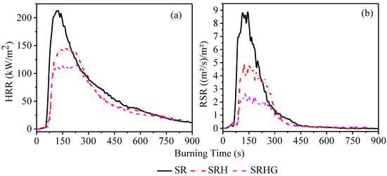 Combustibility of RTV samples (a) heat release rate (HRR) and (b) rate of release of smoke (RSR).