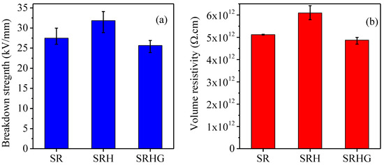 AC breakdown tests are performed as per the IEC60243-1 Standard. Spherical electrodes with a diameter of 25 mm are used in this work. The test sample are sandwiched between electrodes and the whole setup is immersed in transformer oil to avoid surface breakdown. Moreover, applied AC stress of 50 Hz is ramped up at a rate of 2 kV/s until breakdown occurs in the sample. Moreover, a Keithley 8009 resistivity test fixture is used for DC volume resistivity measurement of samples as per ASTM D257. A 40 V DC voltage is applied, and volume resistivity is measured concurrently over a period of 1 minute. The average breakdown strength and volume resistivity results are shown in Figure 4. The average breakdown strengths of SR, SRH and SRHG are measured at 27.47, 31.84 and 25.65 kV/mm for SR, SRH and SRHG, respectively. A similar trend is seen in the volume resistivity of the samples. The volume resistivities of SR, SRH, and SRHG are found at 5.12 × 1012, 6.09 × 1012 and 4.87 × 1012 Ω·cm, respectively. It is well known that graphene is a flame retardant but exhibits good electrical conductivity. From the results, it is evident that 1% of graphene nanoplatelets marginally reduced the electrical breakdown strength and volume resistivity but on the other side, it renders excellent improvement in fire retardancy. Hence, the synergy of optimized concentration of ATH/graphene could be the key for achieving good flame retardancy with desired electrical insulation of RTV.