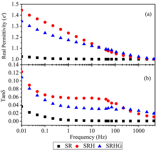 Dielectric response of samples (a) real permittivity and (b) dielectric loss tangent.