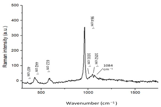 Raman spectrum of the nano-β-tricalcium phosphate indicates the labeled peaks as characteristic of the internal vibration of the PO43− tetrahedric groups of the β-TCP molecule. The symmetric stretching (ν1) of P-O bonds of the tetrahedron corresponds to the peaks with the highest intensity at around 950 cm−1 and 970 cm−1. The asymmetric stretching (ν3) has a lower intensity and is in the 1015–1090 cm−1 range.