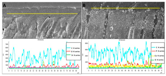 The representative SEM micrographs demonstrating the dentin interaction of the EA and β-TCP-5% adhesive are presented in Figure 3A,B, respectively. Both adhesives showed suitable dentin interaction, which was demonstrated by the appropriate bonding and formation of resin tags of varying depths (Figure 3A,B). The representative line EDX of the EA and β-TCP-5% adhesive are presented in Figure 4A,B, respectively. Elements like carbon (C), oxygen (O), and silica (Si) were detected along the interface for the EA group (Figure 4A). For β-TCP-5%, in addition to the elements found in the EA, calcium (Ca) and phosphorus (P) were also witnessed, which confirmed the presence of β-TCP nanoparticles in our gp-2 (Figure 4B).